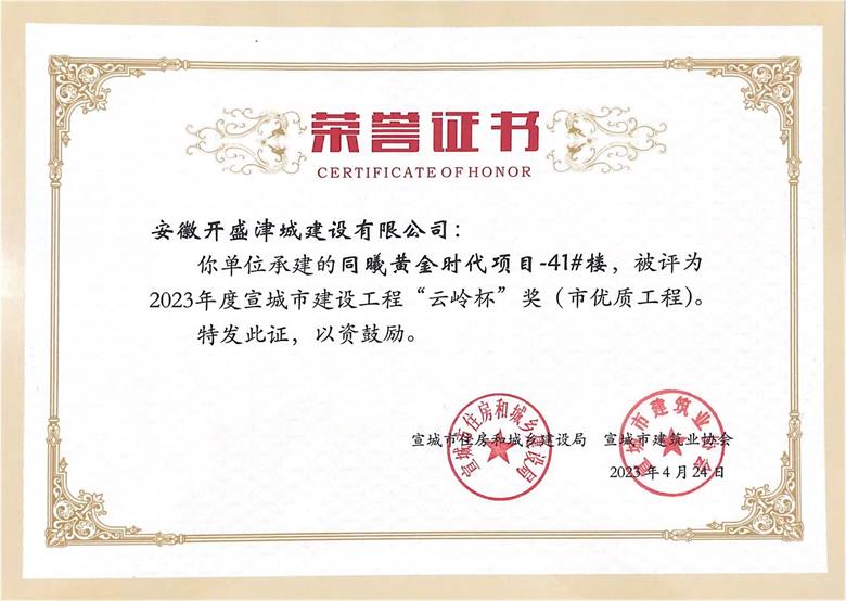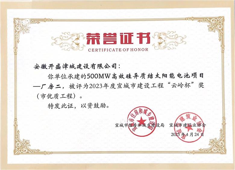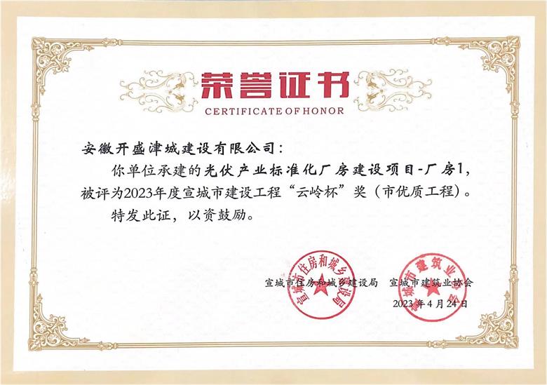 近日,公司承建的500MW高效硅異質結太陽能電池項目---廠房二,同曦黃金時代項目-41#樓,光伏產業標準化廠房建設項目--廠房1項目榮獲2023年度宣城市建設工程“云嶺杯”(市優質工程)獎。